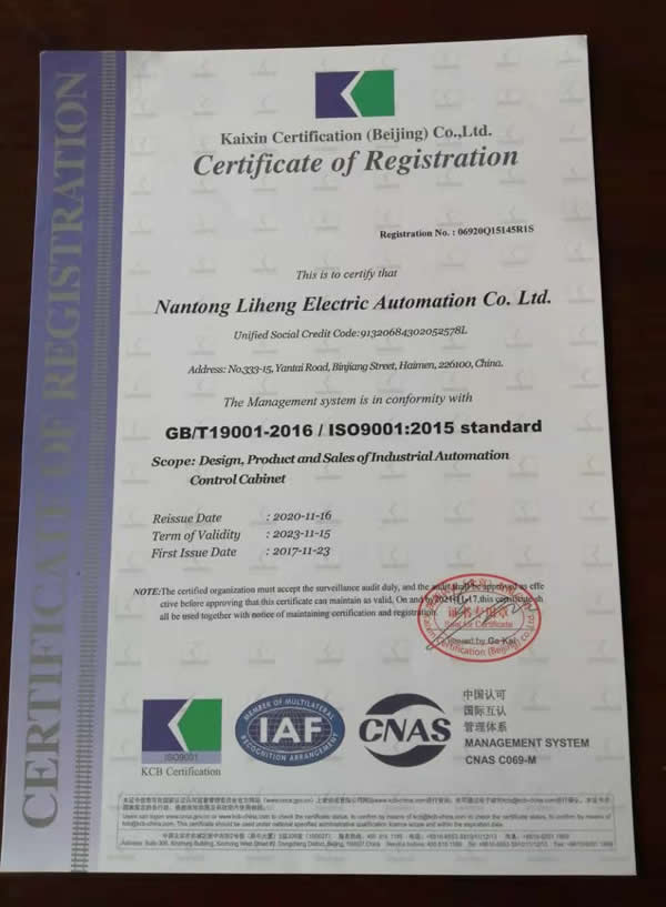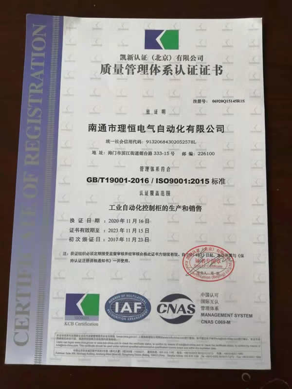 近日,我司工業(yè)自動化控制柜生產(chǎn)和銷售的全面質(zhì)量管理體系通過有關(guān)專家組織的現(xiàn)場考評驗(yàn)收,公司管理體系符合GB/T19001-2016/ISO9001:2015標(biāo)準(zhǔn),換取新證。